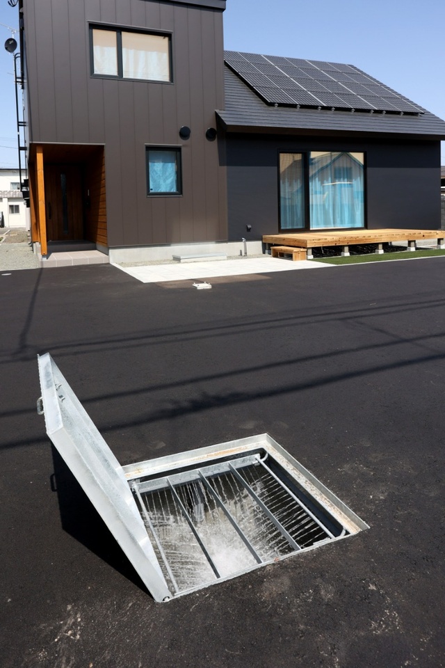 家の外では、地下水を使った融雪槽のデモンストレーションを行いました。稼働中の様子をご覧いただくと「水の勢いが思ったよりすごい!」と驚きの声が。このパワフルな水流が大量の雪をどんどん融かしてくれます。