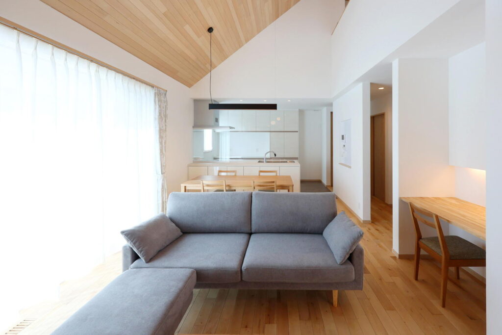 「部屋が広く感じられる」と好評だったのが、リビングの吹き抜けです。傾斜屋根を活かすことで、開放的な大空間が生まれました。