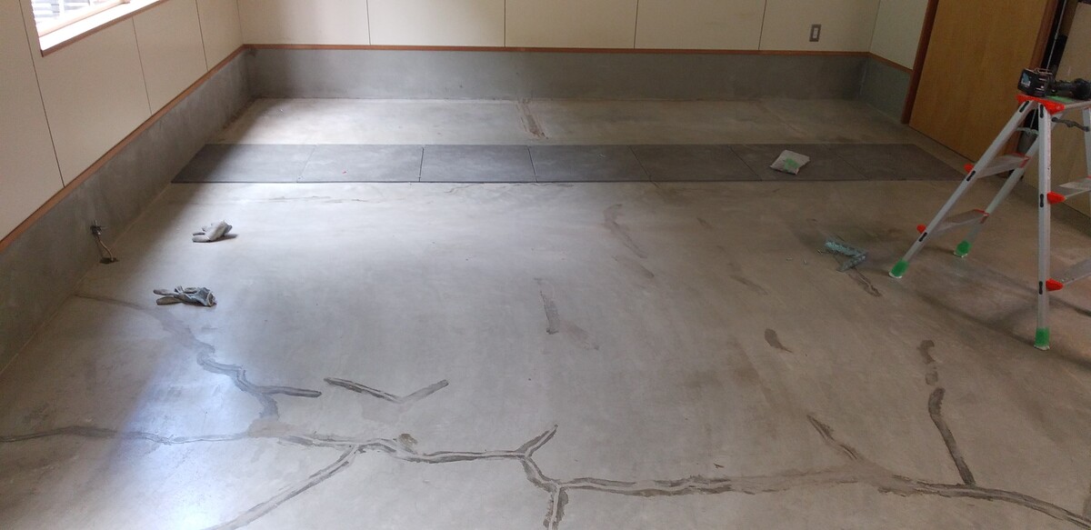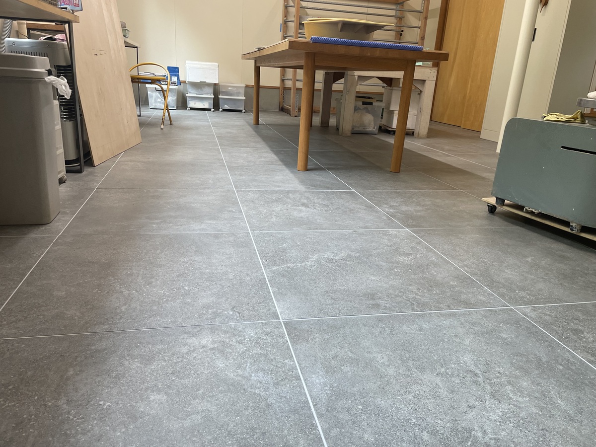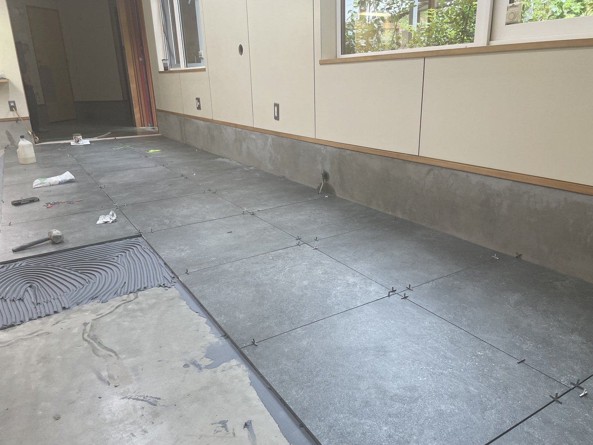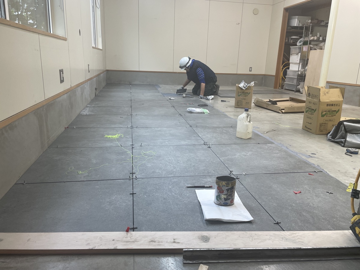 もともとのコンクリート床の上から、1枚1枚、丁寧にタイルを重ねて張っていきます。タイルのサイズは600角の大判タイプを採用しました。