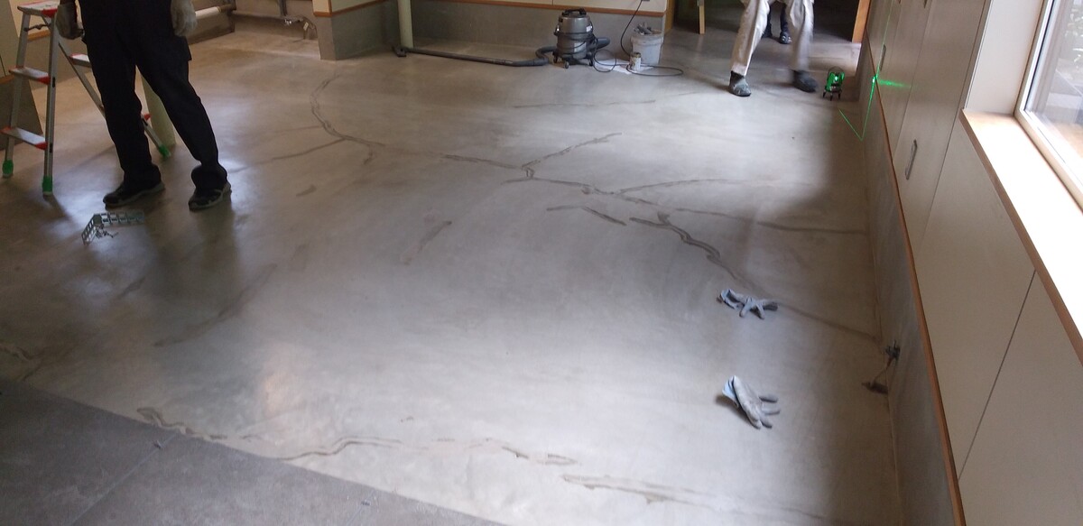 続いて、レーザーを使った測定器で床の傾きをチェックします。これも工事を始める前の大事な作業です。