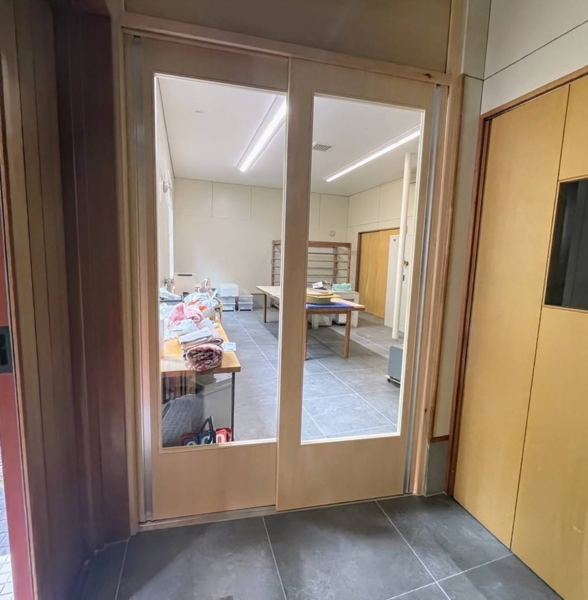 工房の入口には引き違いの扉を新たに造作。手触りが滑らかなシナベニヤを使い、クリア塗装で仕上げています。手前の廊下にも工房内と同じタイルを張り、統一感を持たせました。