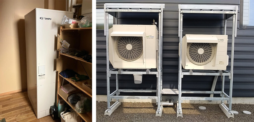 新たに、ヒートポンプ式給湯器「エコキュート」(写真左)とヒートポンプ式温水暖房システム「エネフロー」を設置しています。