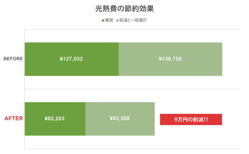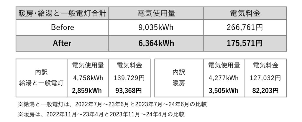 給湯・一般電灯・暖房を合わせた1年間の電気代は、前年26万6,761円から今年は17万5,571円になり、その差額は何と9万円以上に!約34%の削減になりました。