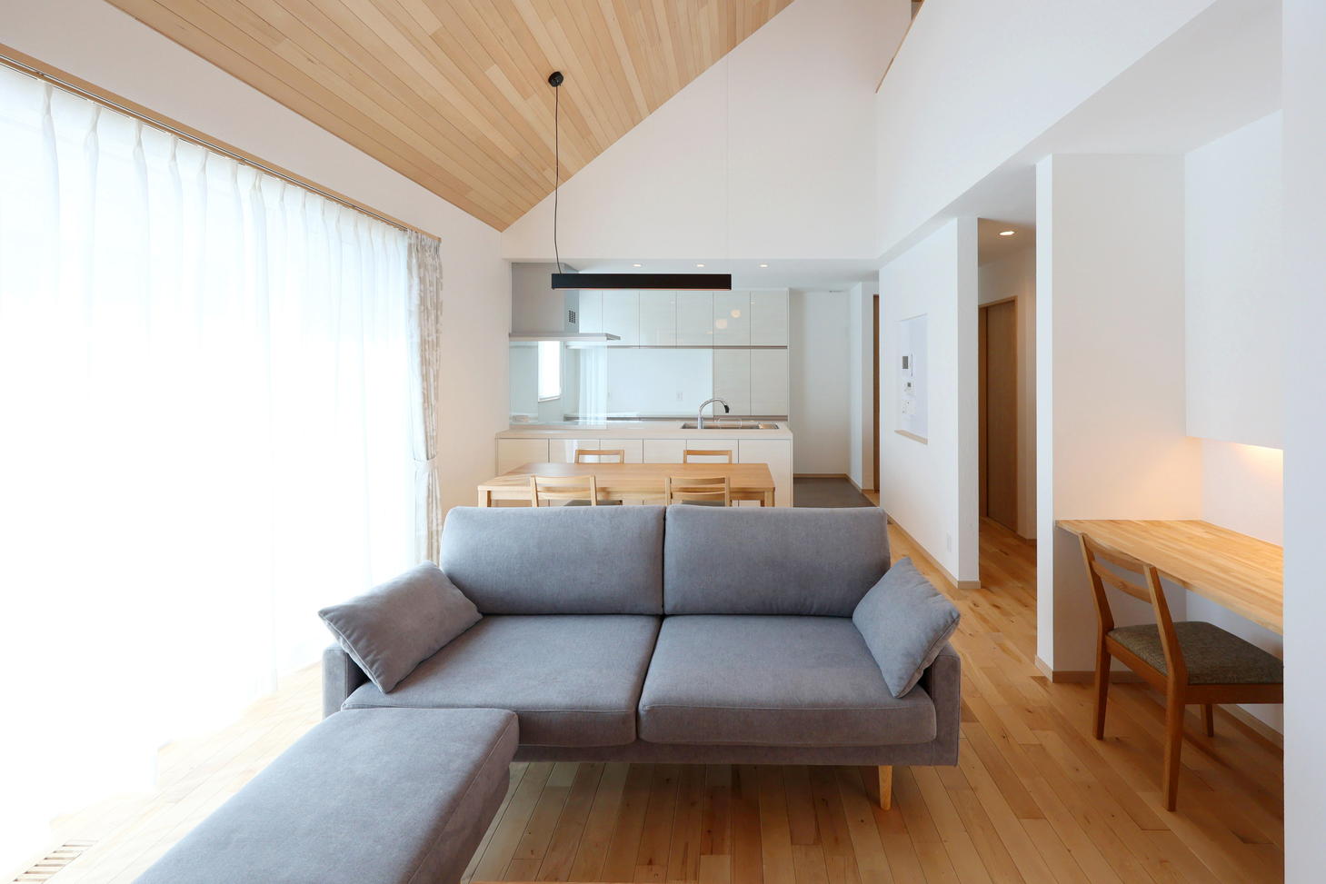 こちらが、4月から7月にかけて公開した「2024モデルハウス」。特徴は、南に面した勾配屋根に太陽光発電システム(4.08kW)を設置したことです。屋根は約39度の急勾配!冬場の積雪を落ちやすくするための工夫です。