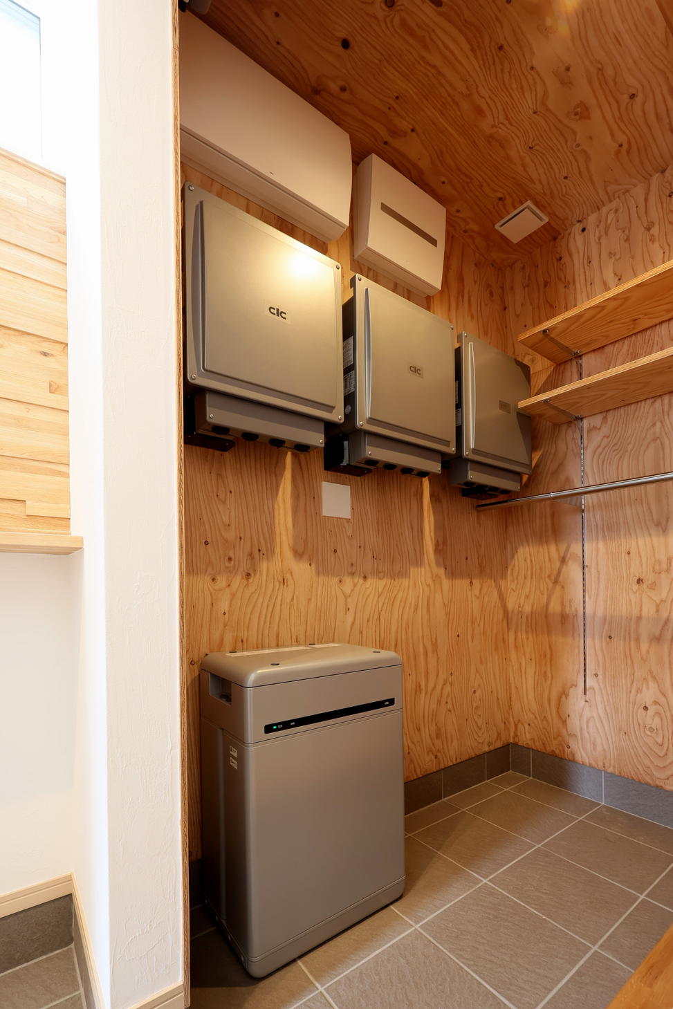 もう一つの特徴が、シューズクロークの中に設置した蓄電池(9.8kWh)。太陽光発電で発電した電気を貯めておくことで、自家消費率アップにつながります。
