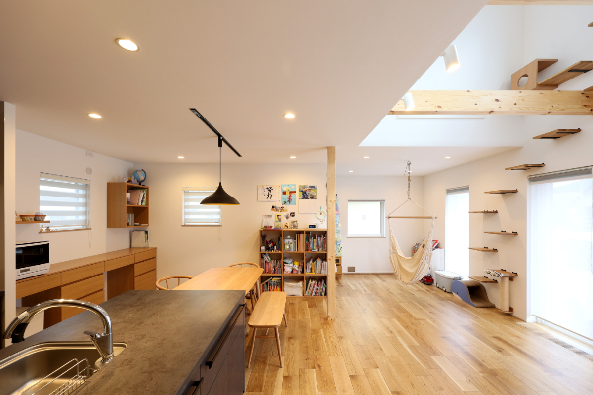 こちらは札幌市のSさま邸。ご夫婦、中学3年と4歳の男の子、1匹の猫ちゃんという家族構成を踏まえた住まいです。LDKではハンモックとキャットウォークが目を引きます。