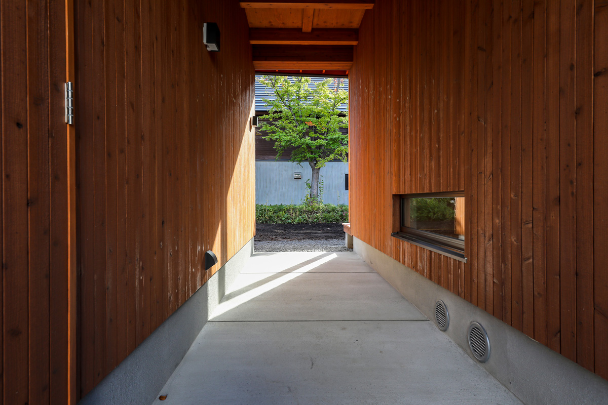 Iさまのご要望は、隣り合う親戚宅との距離感を大切にしながら、通り抜けができる連続性を持たせること。設計した一原さんは、かつて農家住宅にあった土間空間からヒントを得て、半外部の通り庭という形でご要望を実現しました。