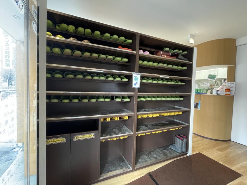 たくさんのスリッパが並ぶのも小児歯科ならではの光景です。ご家族で来院されるのでスリッパがなくならないよう、大容量のスリッパ置き場を備えました。