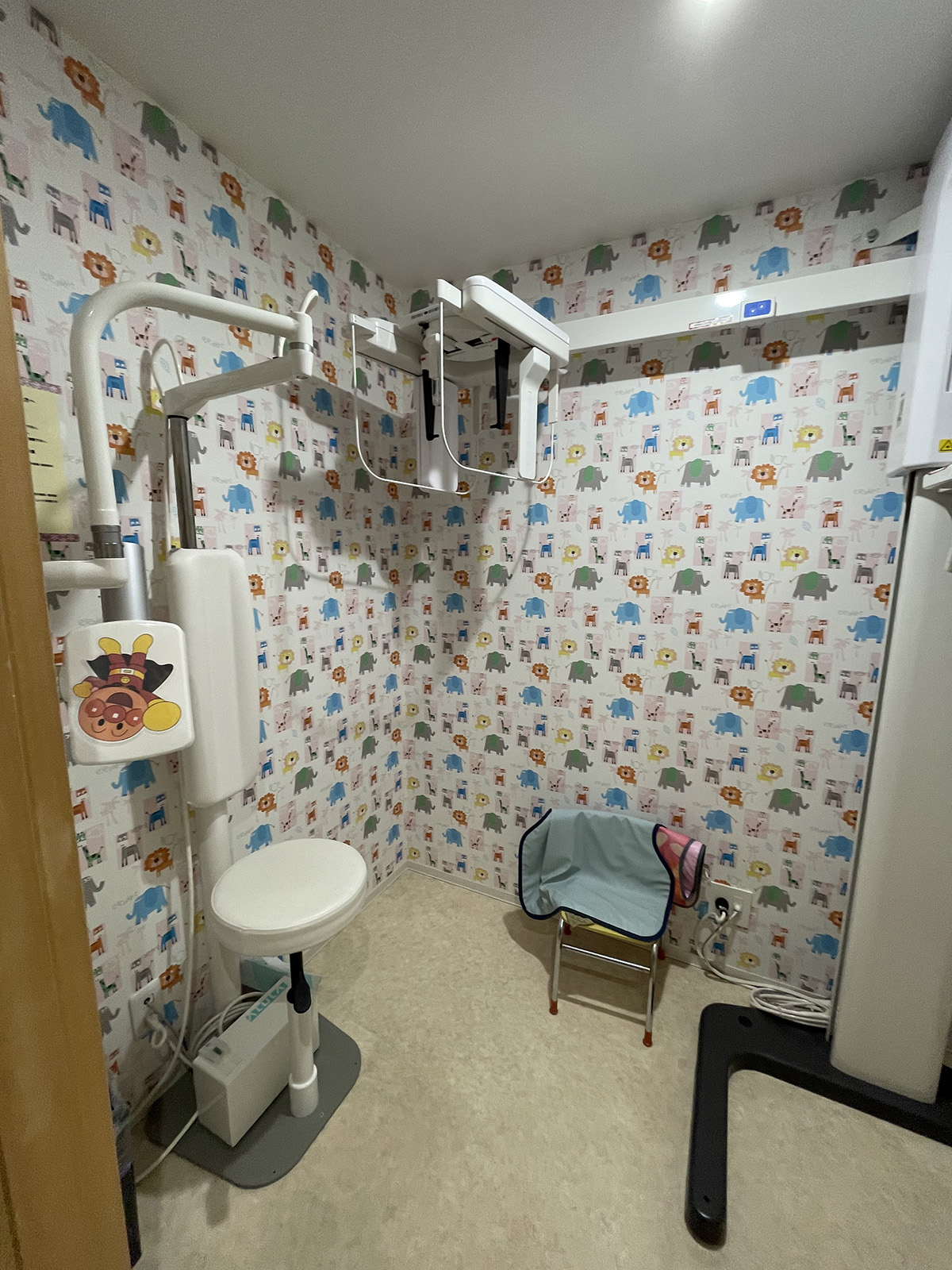 X線室の壁紙はかわいいアニマル柄。これも不安を和らげる工夫ですね。