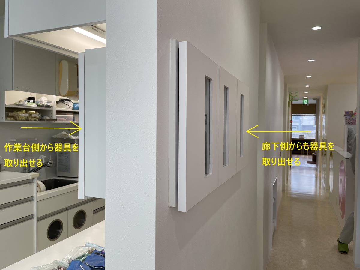 作業台の収納には廊下側にも扉を設置。作業台側にスタッフがいても、邪魔することなく器具が取り出せます。