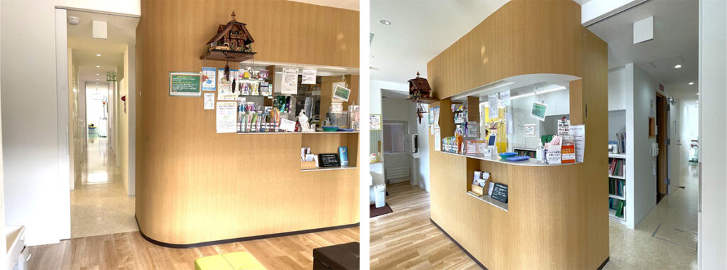 最も特徴的なのが回遊動線です。受付の左右どちらにも通路があり、診察スペースを回ってぐるっと一周することが可能。スタッフ同士の行き来もしやすく、作業効率もアップしたそう。