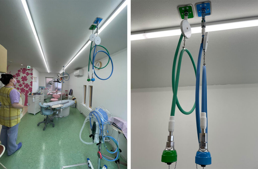 診察室の天井には酸素と笑気ガス(吸入麻酔薬)が出る管が吊るされていました。そら小児歯科クリニックさんでは笑気吸入鎮静法による「さわやか診療」を実施中。酸素と混ぜた笑気を鼻から吸い込むことで、不安や恐怖感が和らぎ、リラックスして治療ができるそうです。
