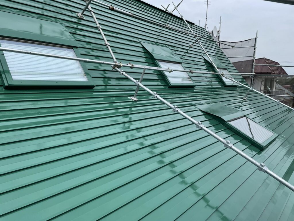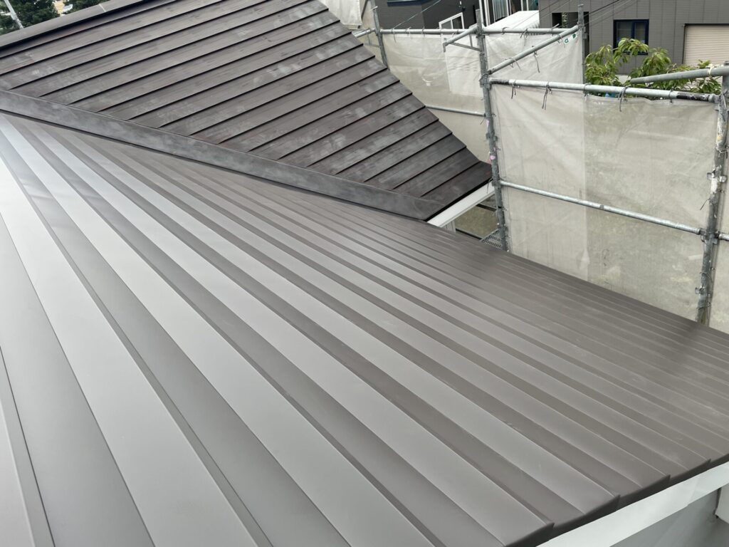 防水シートの上に新しい屋根材を張って補修が終了。奥の張り替えていない部分と見比べると、見違えるほどキレイになったのが分かります。