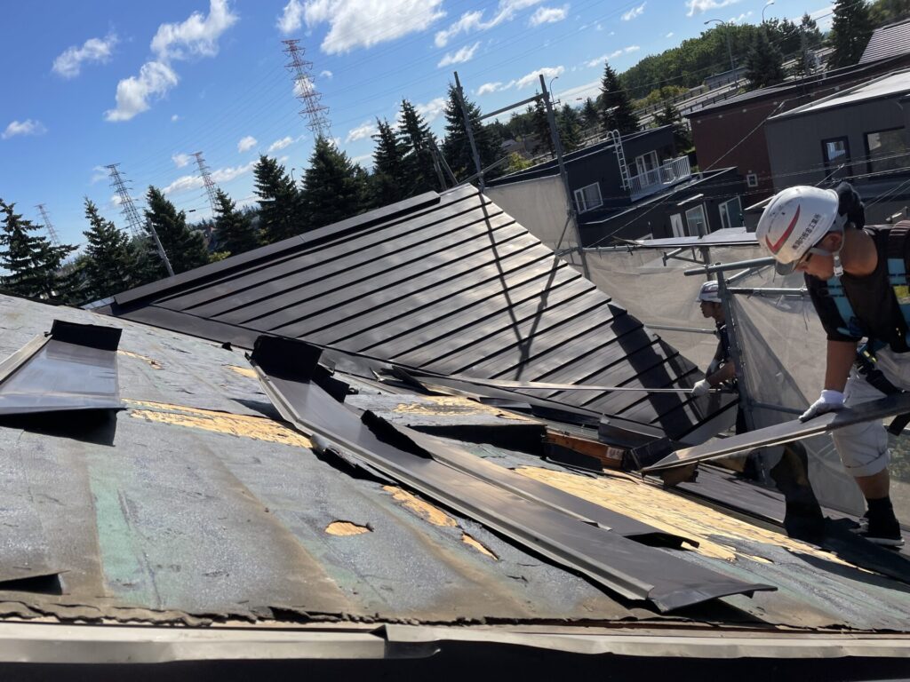 修繕工事がスタート。まずは既存の屋根材をはがします。