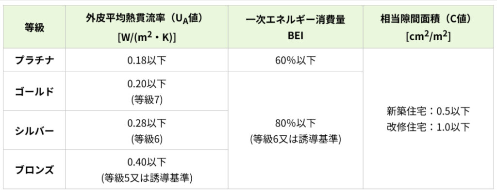 一方、札幌市では独自の基準を設けた「札幌版次世代住宅補助制度」を行っています。上位から「プラチナ」「ゴールド」「シルバー」「ブロンズ」の4等級。断熱性能の項目(表の一番左)を見ると、「プラチナ」と「ゴールド」はGX志向型住宅よりもさらに厳しい基準であることが分かります。この2つが補助対象となっており、目指す性能が高い分、補助額もGX志向型住宅よりも多くなります。「プラチナ」で220万円/戸、「ゴールド」で180万円/戸の補助が受けられます。