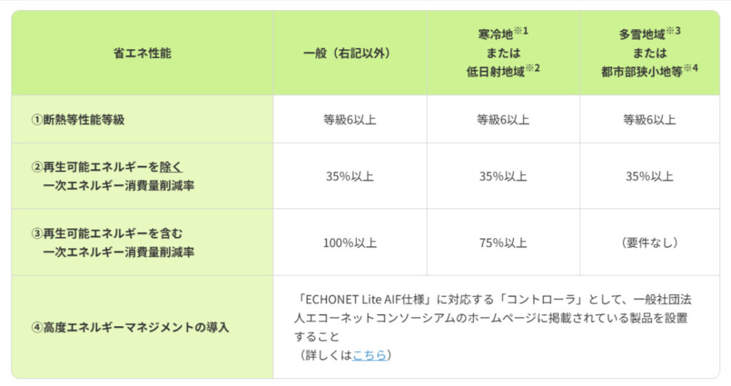 ただし北海道など寒いエリアには緩和措置があり、寒冷地であれば③の削減率は75%以上でOK。さらに多雪地域であれば再エネの設置も免除されます。