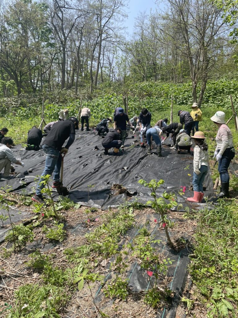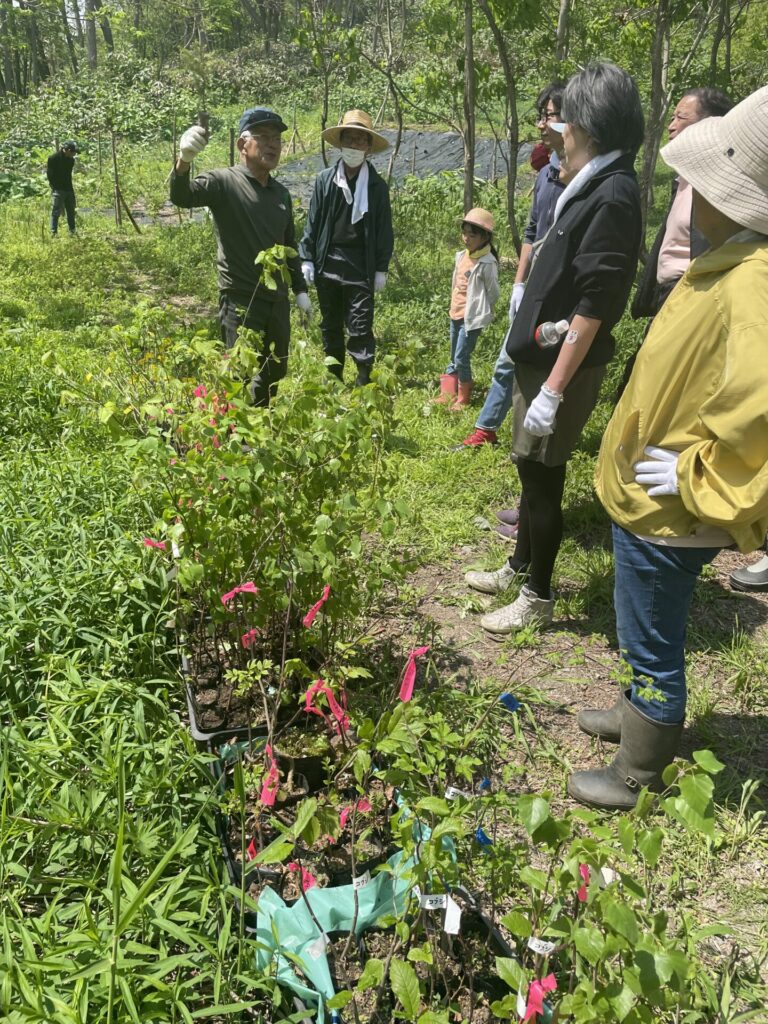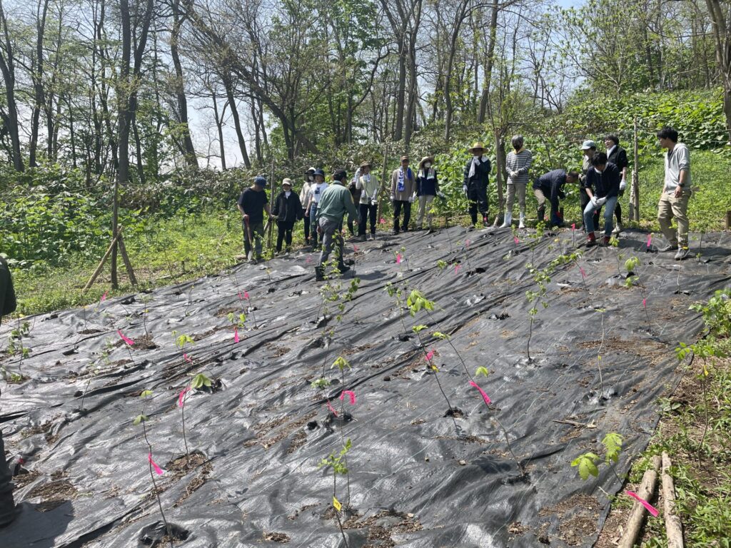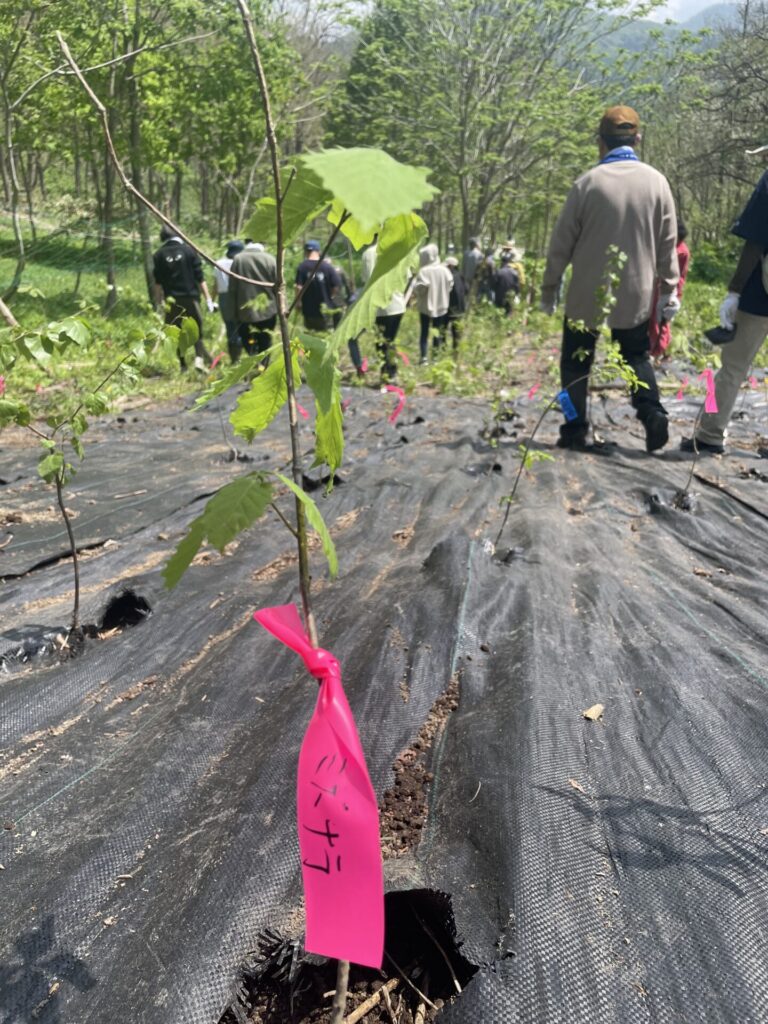 防草シートの穴をあけた部分に今年はヤチダモ、ミズナラ、コブシ、イタヤカエデなど約120株のポット苗を植えました!