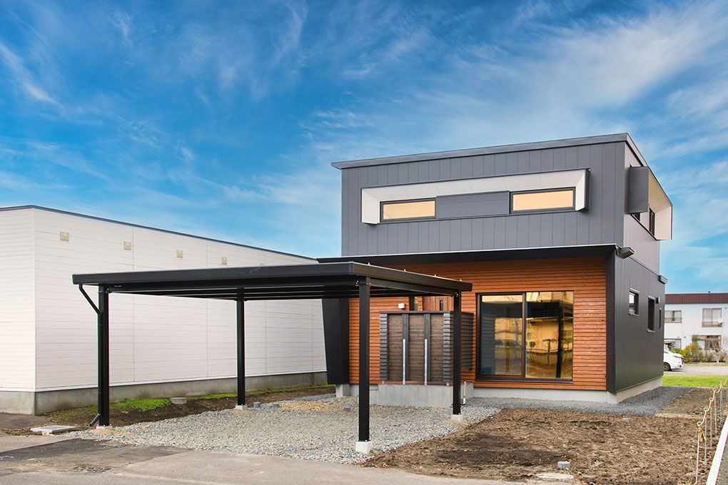 外壁に溶け込む壁面太陽光パネルがアクセントの「2023モデルハウス」。垂直設置なので積雪期でもバッチリ発電できます。