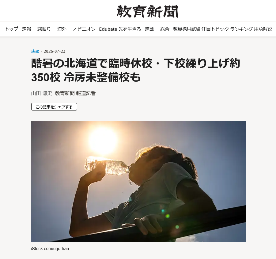 今年の夏は暑すぎて、7月下旬には札幌近郊の小学校から高校までが臨時休校になったり、下校時間を早める対応もみられました。公立校はまだ教室にエアコンがあまり設置されていないため、熱中症対策だったそうです。