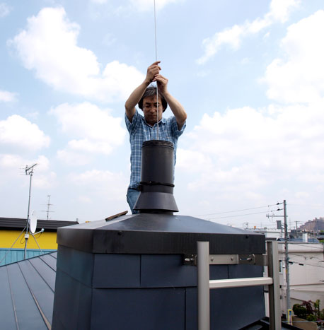 足元に十分気をつけながら、いざ屋根の上へ。専用ブラシの先に柄をつなぎながら煙突の中に差し込んでいき、何回か上下させて煤を下に落とします。