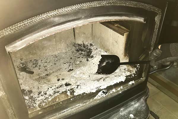 続いては、ストーブ本体の掃除です。炉内にたまっている煤(すす)や灰はすべて取り除きます。