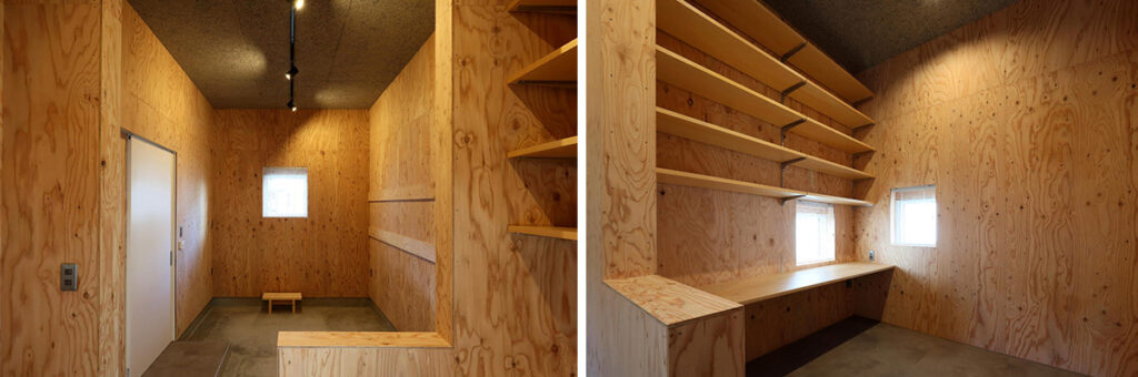 サイクリングが趣味のオーナー様のお宅には、二間続きの工房を作りました。左側が愛車10台分の駐輪スペース、右側がメンテナンスコーナーです。