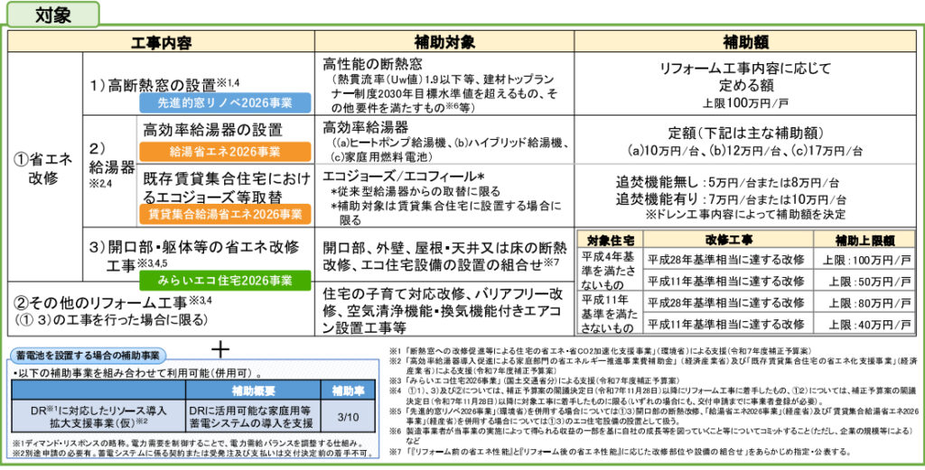 一方、リフォームはすべての世帯が対象です。条件は、開口部や躯体などの断熱改修工事とエコな住宅設備の導入を組み合わせて行うこと。子育て対応改修やバリアフリー改修も同時に工事をすれば対象となり、1戸当たり最大100万円が補助されます。