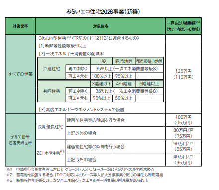 まず、すべての世代の方が対象となるのが「GX志向型住宅」。125万円/戸が補助されます。