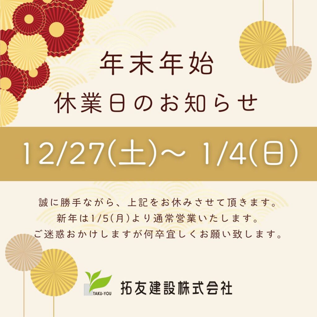 休業期間:12月27日(土)~ 1月4日(日) ※1月5日(月)から通常営業。最終営業日:12月26日(金) ※仕事納めとさせていただきます。
