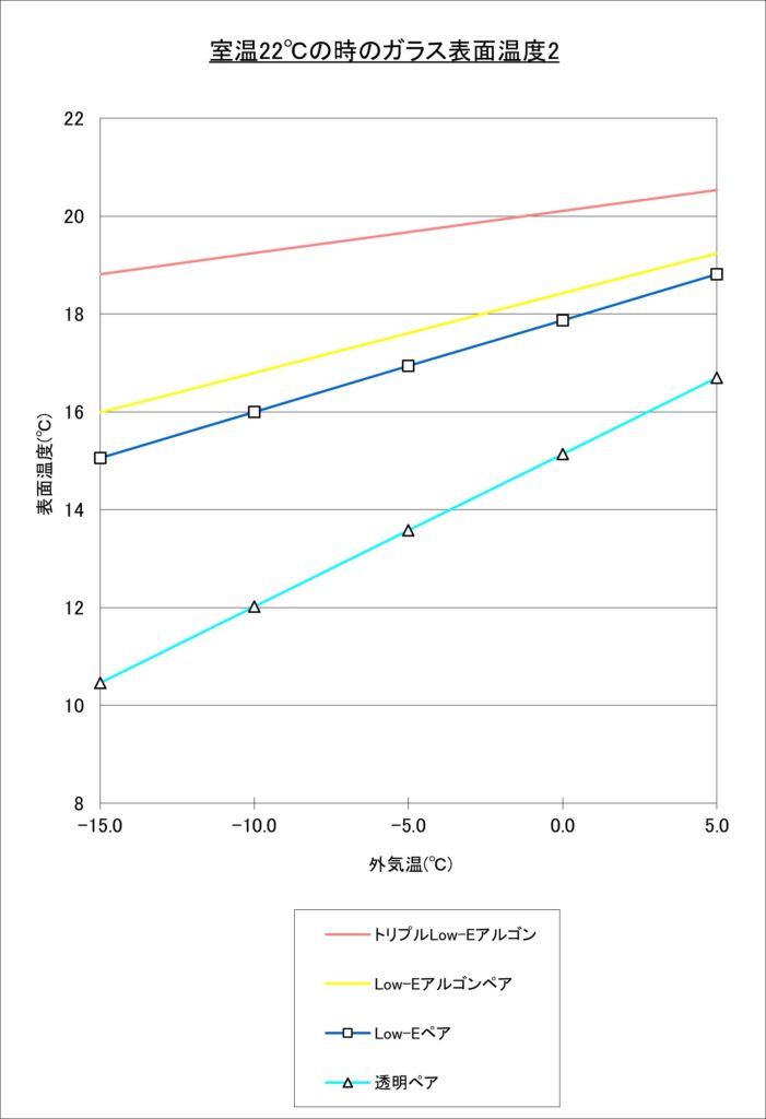こちらのグラフは、室温22℃の時の窓ガラス表面温度を示したもの。性能の高い順に、「トリプルLow-Eアルゴン」「Low-Eアルゴンペア」「Low-Eペア」「透明ペア」となっています。