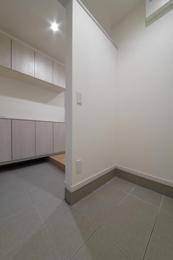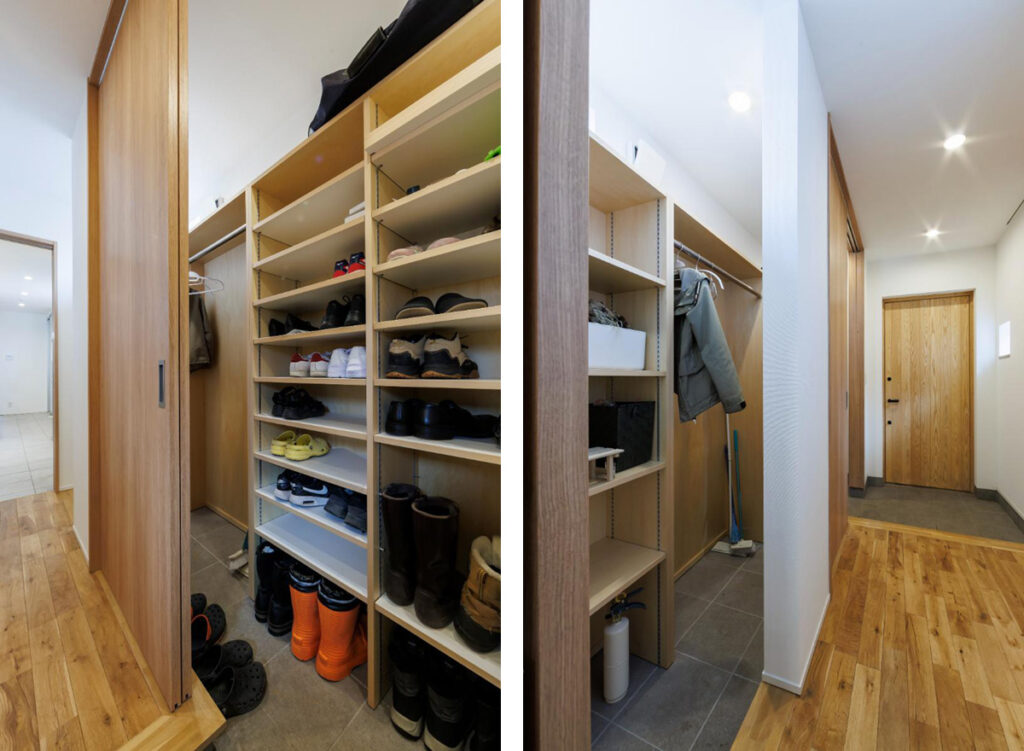 まず玄関エントランスの右手に、たっぷりの土間収納を確保。