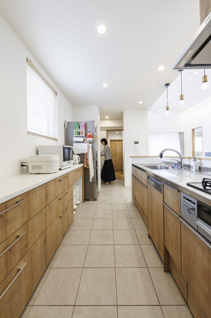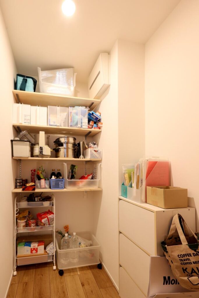 パントリーの先にはキッチンが続きます。買い物からの帰宅後、キッチンまでの動線上で収納するという、Kさまの生活スタイルに合わせたプランです。