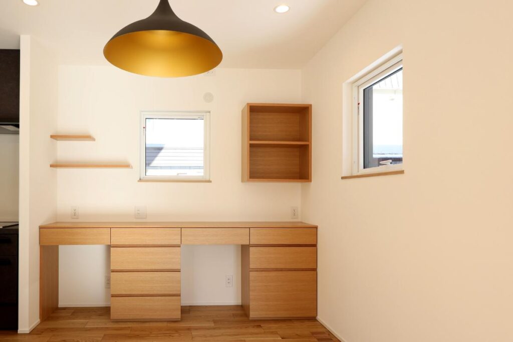 また、キッチンの並びに収納棚を造作。リビングで勉強する息子さんの勉強道具がしまえます。