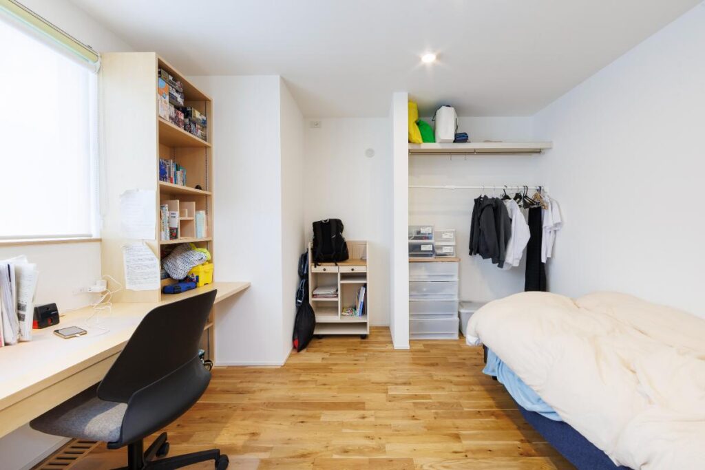 書斎の隣りは息子さんの部屋。オープンタイプのクローゼットや勉強道具置き場、本棚と、充実した収納スペースを設けています。