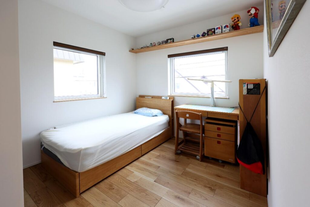 兄弟の年が離れているので子ども部屋は1つのみ。建具扉のないオープン収納を採用しました。勉強机の上に棚板を造作し、お兄ちゃんの大事なコレクションを飾っています。まだ小さい弟さんの手が届かない高さもポイントです。