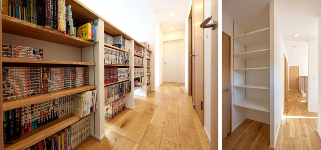 2階の廊下には本棚を造作(写真左)。ちょっとした空間を活用したオープン棚もあり、一番下は猫ちゃんのトイレスペースになっています(写真右)。