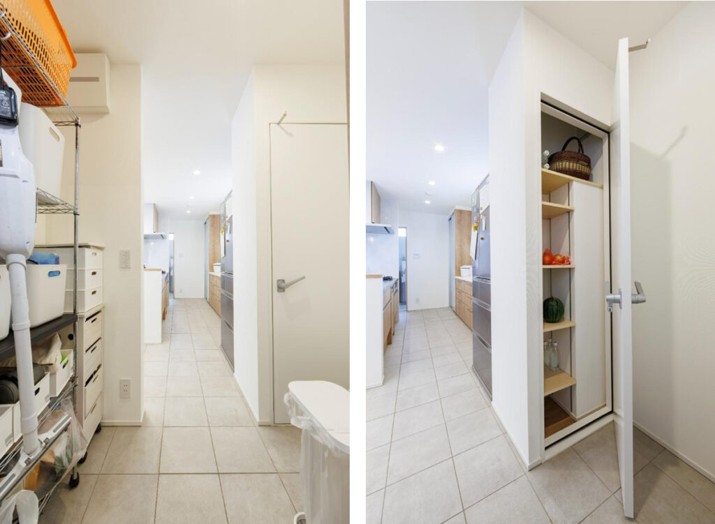 エントランスからまっすぐに進むと、パントリーへとつながります(写真左)。右手の扉の中は食品庫です(写真右)。