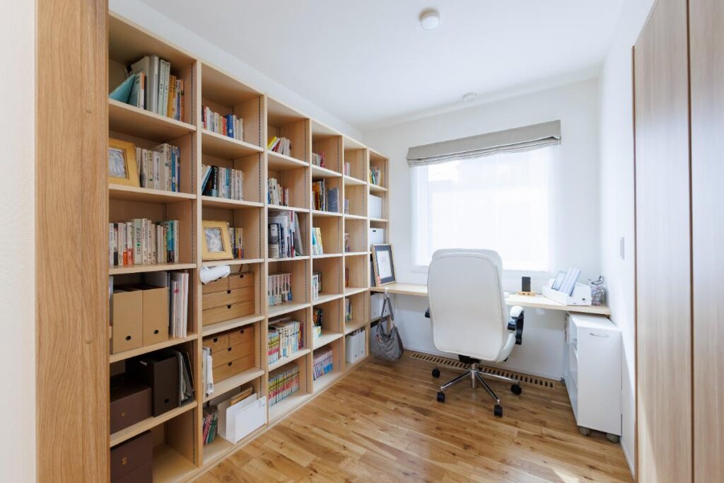 書斎にはたくさんの本をお持ちの奥さまのご要望で、壁一面の本棚を造作しました。