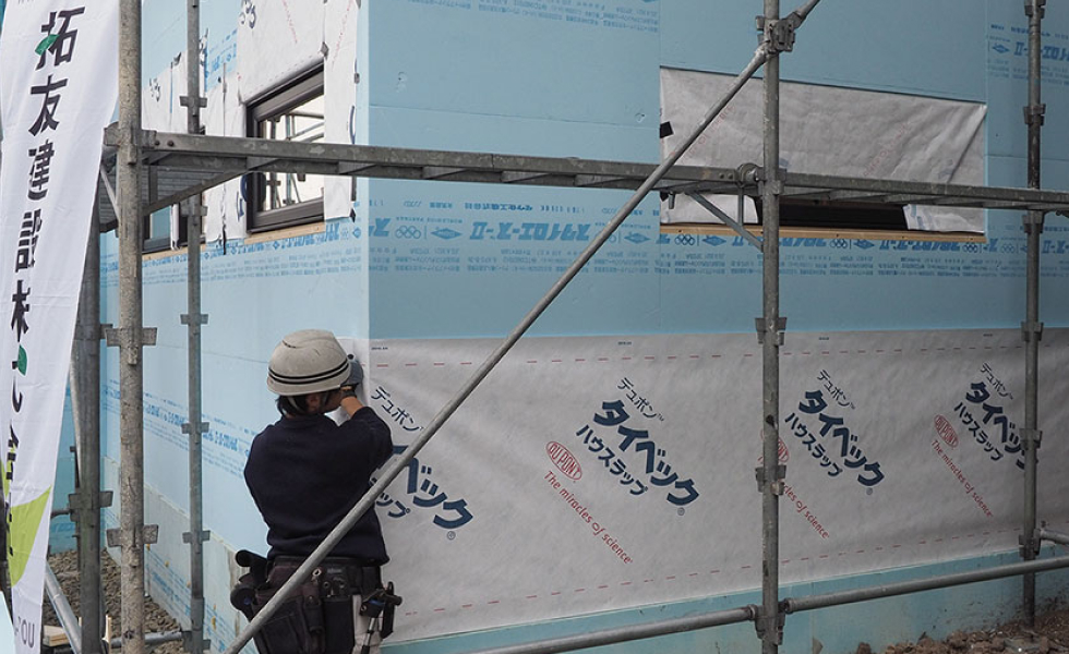 拓友建設では建物の主要構造部をまるごと包み込む「外張り断熱(SHS工法)」を採用しています。断熱材の設置工事が終わったあとでも施工状態を確認できる“見える安心”が特長です。