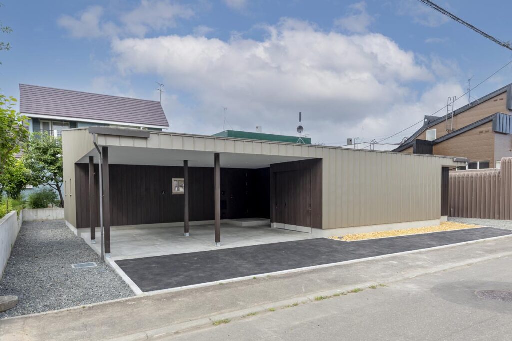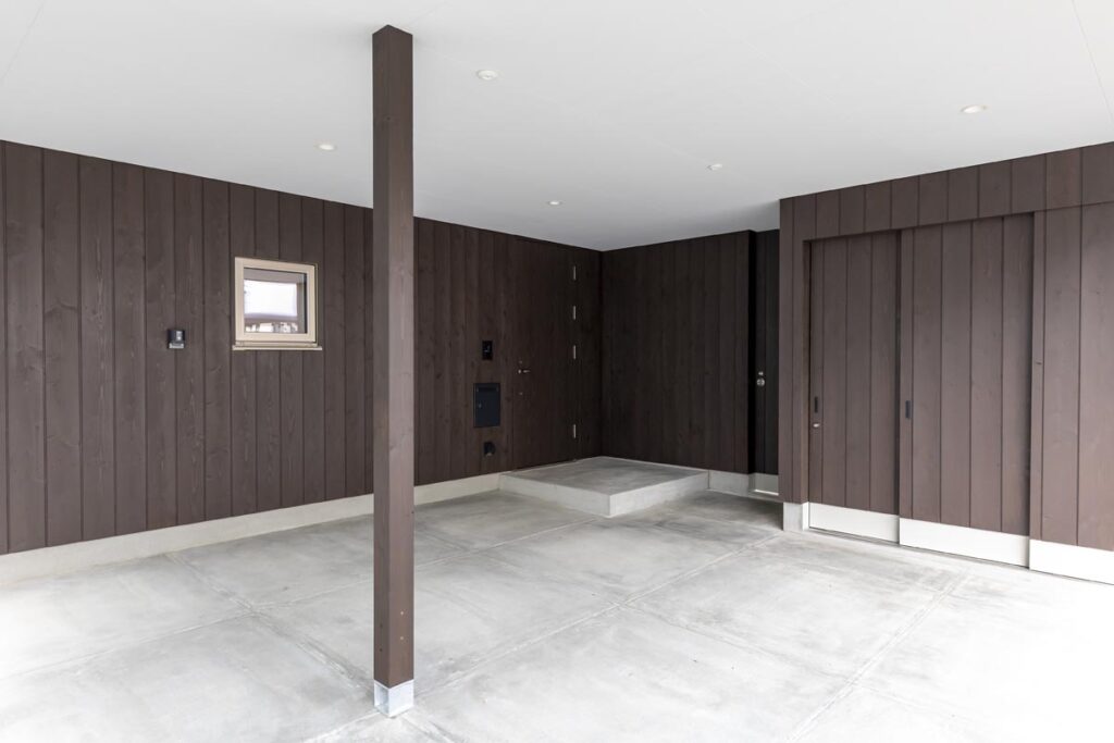 建築面積の4分の1近くを占める大きなポーチは、車2台が駐車できる余裕の広さ。物置もポーチに組み込まれており、雨や雪の降る日の荷物の出し入れ、車への積み込みなどに便利です。冬の降雪時には、除排雪の負担も軽減されます。