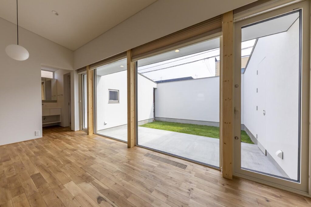 大開口の窓の外には、インナーコートが広がります。高い塀に囲まれているので、往来の視線を気にすることなく、家族の時間を過ごせます。 リビングダイニングからの視界も良好。中で家事などをしながら、外で遊ぶお子さまの様子を見守れます。