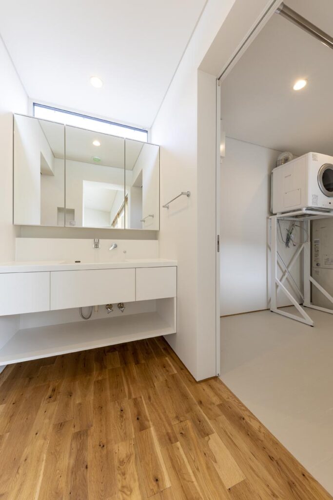 洗濯脱衣室には物干しとともに収納棚を設置できるスペースを確保。洗濯物を洗う、干す、収納するが一カ所で行えます。洗濯機置き場の上には、ガス衣類乾燥機「乾太くん」を設置しました。