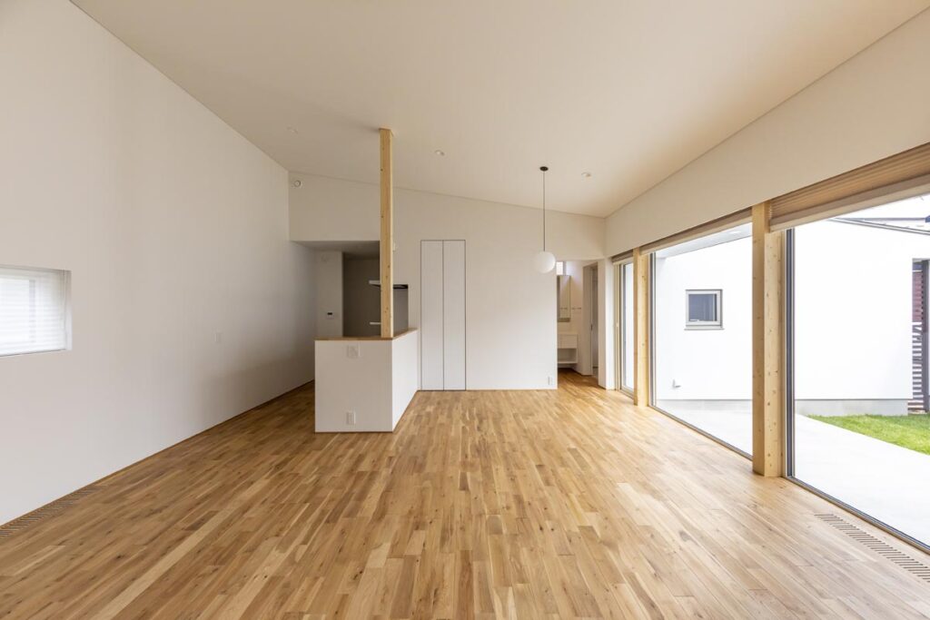 木目とホワイトで統一されたナチュラルでシンプルなリビングダイニング。フローリングにはナラの無垢材を使用しています。