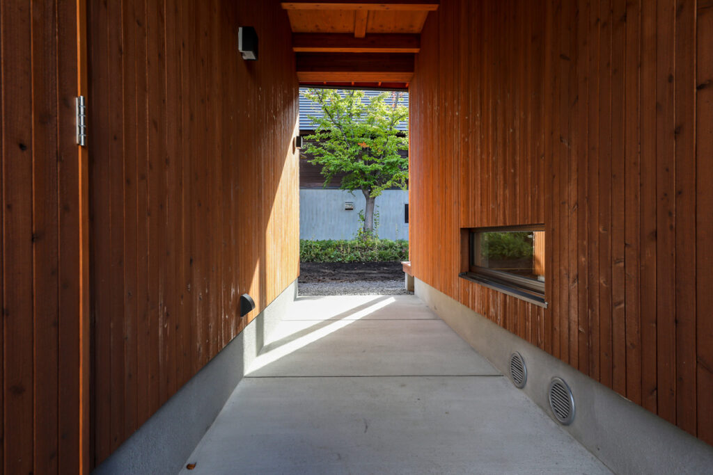 Iさま邸のシンボル的存在になっている通り庭は、通路としてはもちろん、作業場としても活用できます。屋根に覆われた部分にだけ、贅沢に木材が使われているため、メンテナンスの心配もありません。通路の奥に見えるのは桜の木。春になったら、枕木を使って親戚宅へつながるアプローチを造る予定です。