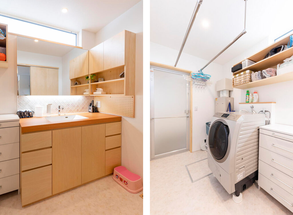 引き出しと扉収納で使い分けができる洗面台は、奥さまのイメージをもとに造作したオリジナル。壁収納も付けました。