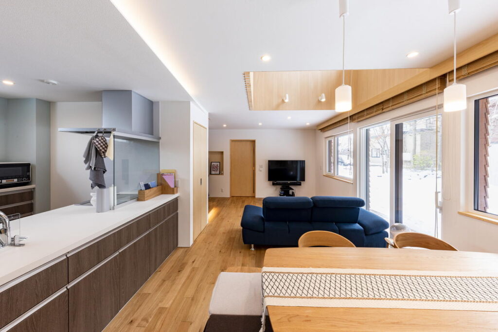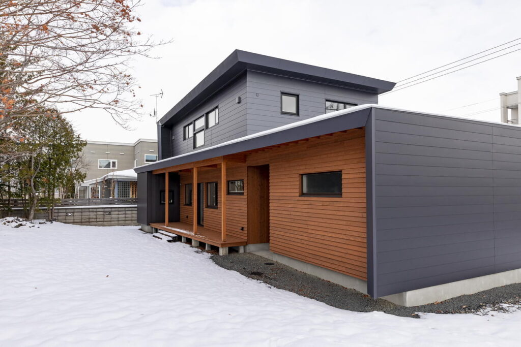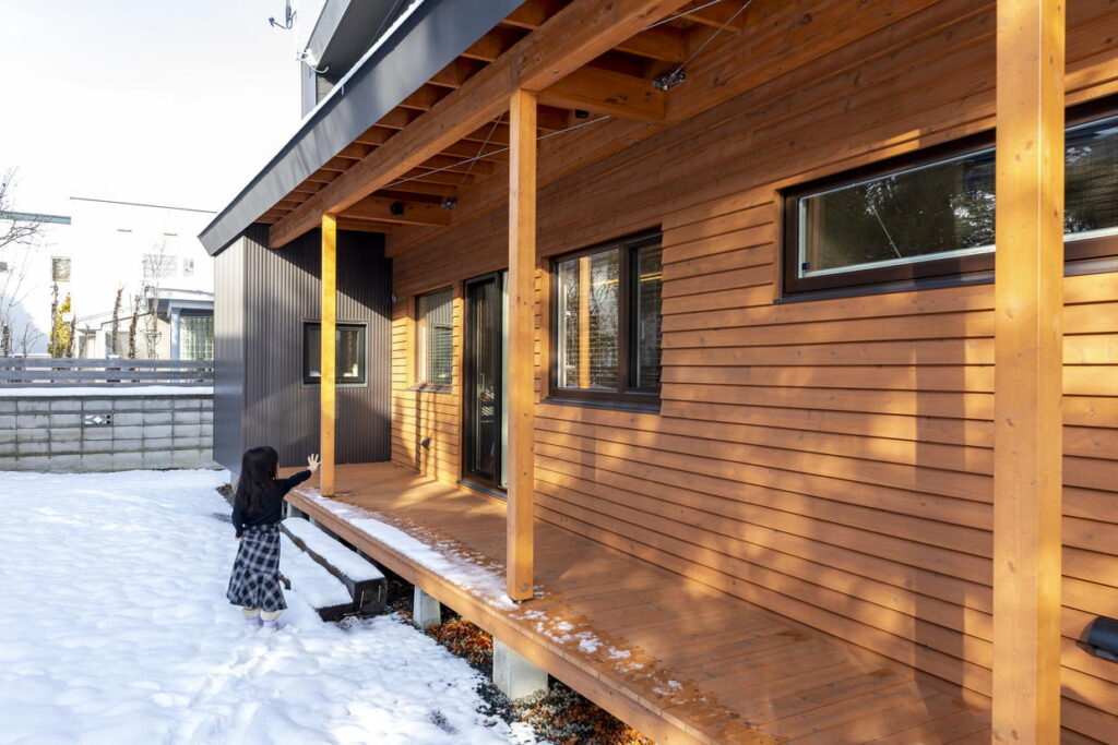 拓友建設の施工とHorizon Architectsの設計によって完成したIさま邸は、札幌中心部から少し離れた閑静な住宅地にあります。ご主人の親戚宅と隣り合うように建てられた新居は、間口が17m近くもあるファサードと、住まいを貫く通り庭が印象的。ご家族4人が暮らす個性的な新居は、はたしてどのように完成したのでしょうか。