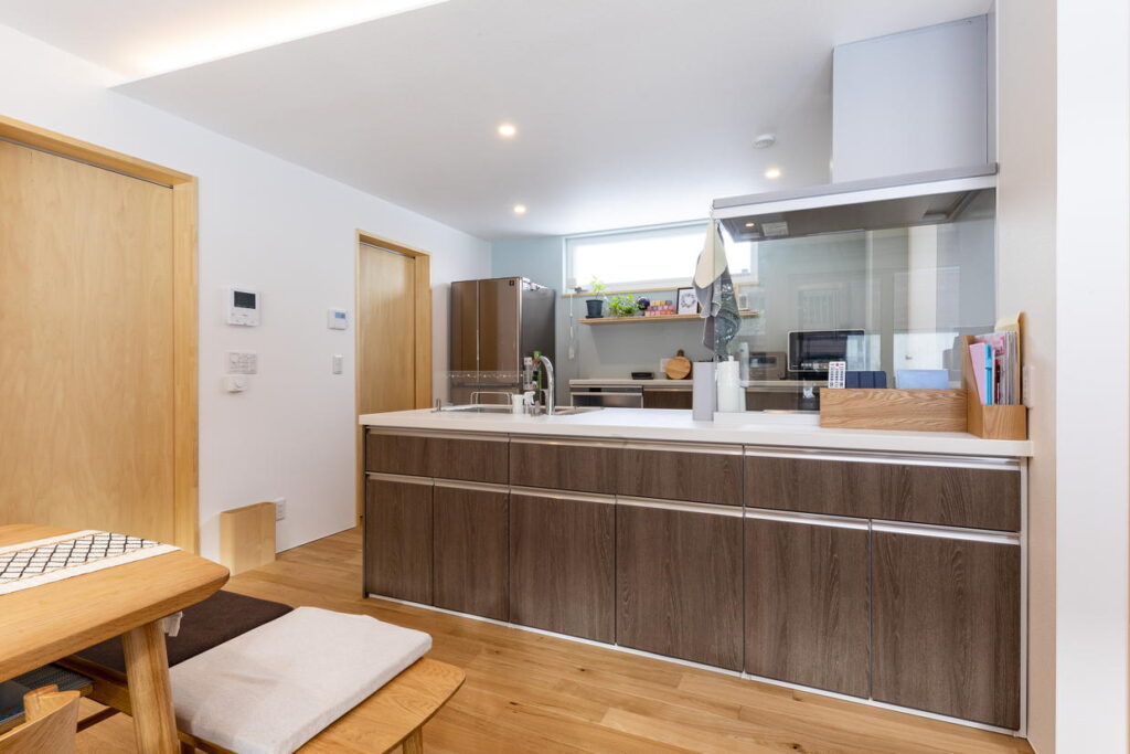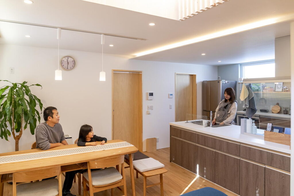 Iさま邸は、通路や作業場などに活用できる「通り庭」がシンボル的存在の住宅です。この通り庭を介して、隣接する親戚のお宅ともほどよい距離感でゆるやかにつながっています。一方、リビングに設けた吹き抜けは、外から光を採り込むとともに、自然エネルギーを活用した「パッシブ換気」の仕組みによる空気の通り道の役割を果たしています。室内はナチュラルテイストでカフェのような空間になりました。現代の技術やライフスタイルが融合した現代版農家住宅です。Iさまのお父さまはかつての会社の同僚で、今でも通勤時に拓友建設の前を通っているそうです。当時のご縁から30数年ぶりにご連絡があり、息子さんの新築をご依頼いただきました。