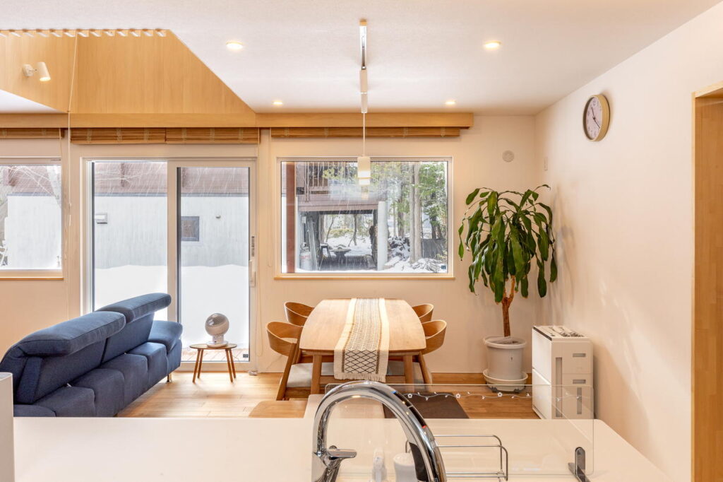 キッチンの正面には、窓越しに針葉樹が美しい雪景色が広がっていました。