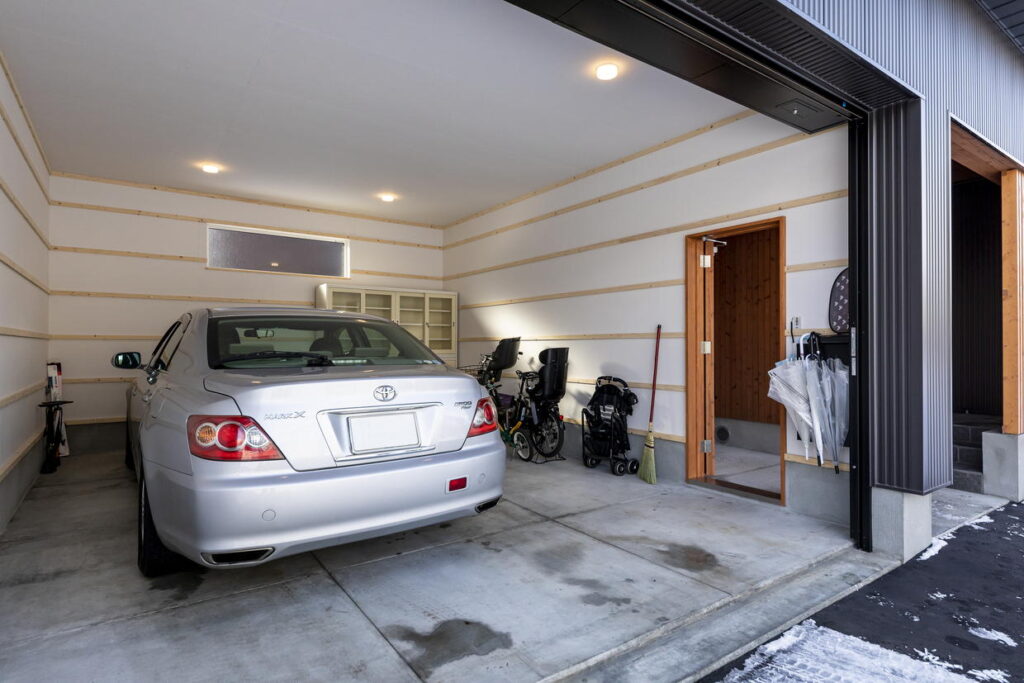 ガレージには防火上、木の板が張れません。白い壁に貼られた垂木(たるき)は、今後、棚などをDIYしたくなった時に活用するためのアイデアです。