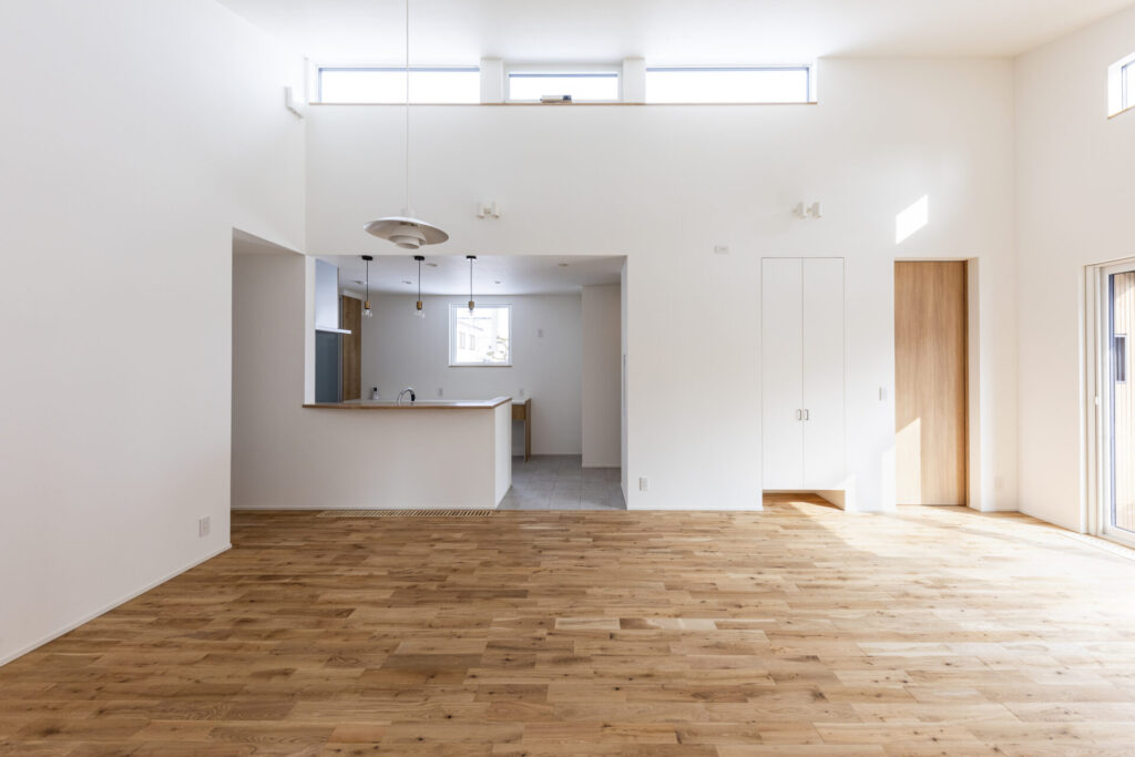 「自然光が多く入る明るい家にしてほしいと、設計の西川さんに伝えました」と、Kさん。吹き抜けの片流れ屋根にしたことで天井が高くなり、そこに高窓を設置して東側の日差しを取り入れています。